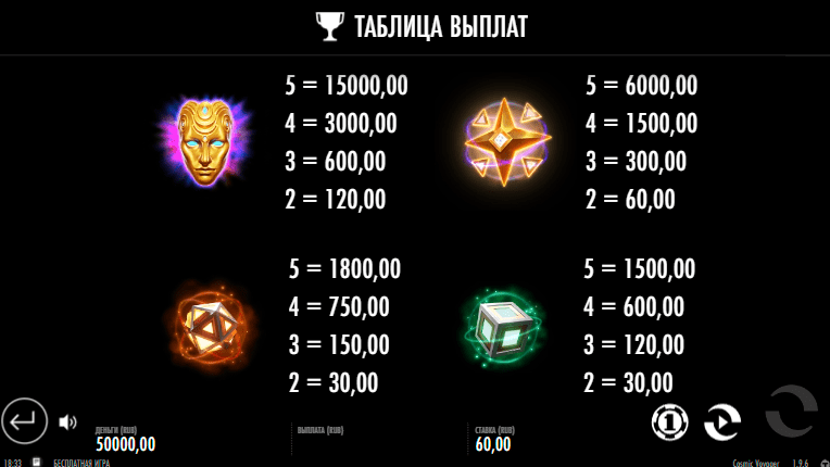 Чтобы вы вообще могли начать играть в Cosmic Voyager онлайн, вам нужно выбрать ставку от 10 до 10 000 рублей. Этот диапазон ставок подходит не только для новичков и лоуроллеров, но и для хайроллеров.