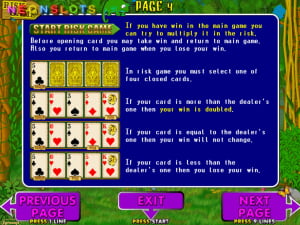 После того, как выпадет выигрышная комбинация, вы активируете риск-игру, если вы хотите сыграть в нее, вам нужно будет нажать на кнопку ставки. Откроется новый экран с 5 перевернутыми картами. Вам нужно выбрать одну, используя кнопку линии под картой, которую вы хотите выбрать, и если она выше, чем у дилеров, вы удвоите сумму своего выигрыша и сможете продолжить или забрать свой выигрыш. Если это то же значение, что и у дилера, вы ничего не выигрываете, но и ничего не теряете, если ваша карта ниже, чем у дилера, вы теряете свой выигрыш и возвращаетесь к основной игре.
