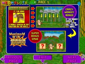 Если в любом месте на барабанах появятся 3 или более символов прыгающей обезьяны, они запустят бонусную игру с максимальной суммой выигрыша 168 750. Откроется новый экран, и вы увидите Обезьяну в левом нижнем углу экрана и 5 веревок, свисающих с верхней части экрана с надписью «Потяните вниз». Вам нужно нажимать на кнопки линий, чтобы тянуть за все веревки и если бананы упадут вы их съедите, увидите награду и перейдете на следующую веревку, однако если на вас упадет наковальня, вы проиграете и вернетесь в игру. Если вы переживете все веревки, вы запустите супер бонусную игру. На нем есть два поля со знаками вопроса, под одним слева написано: «Нажмите 3, чтобы выбрать», а под другим справа — нажмите 7, чтобы выбрать.